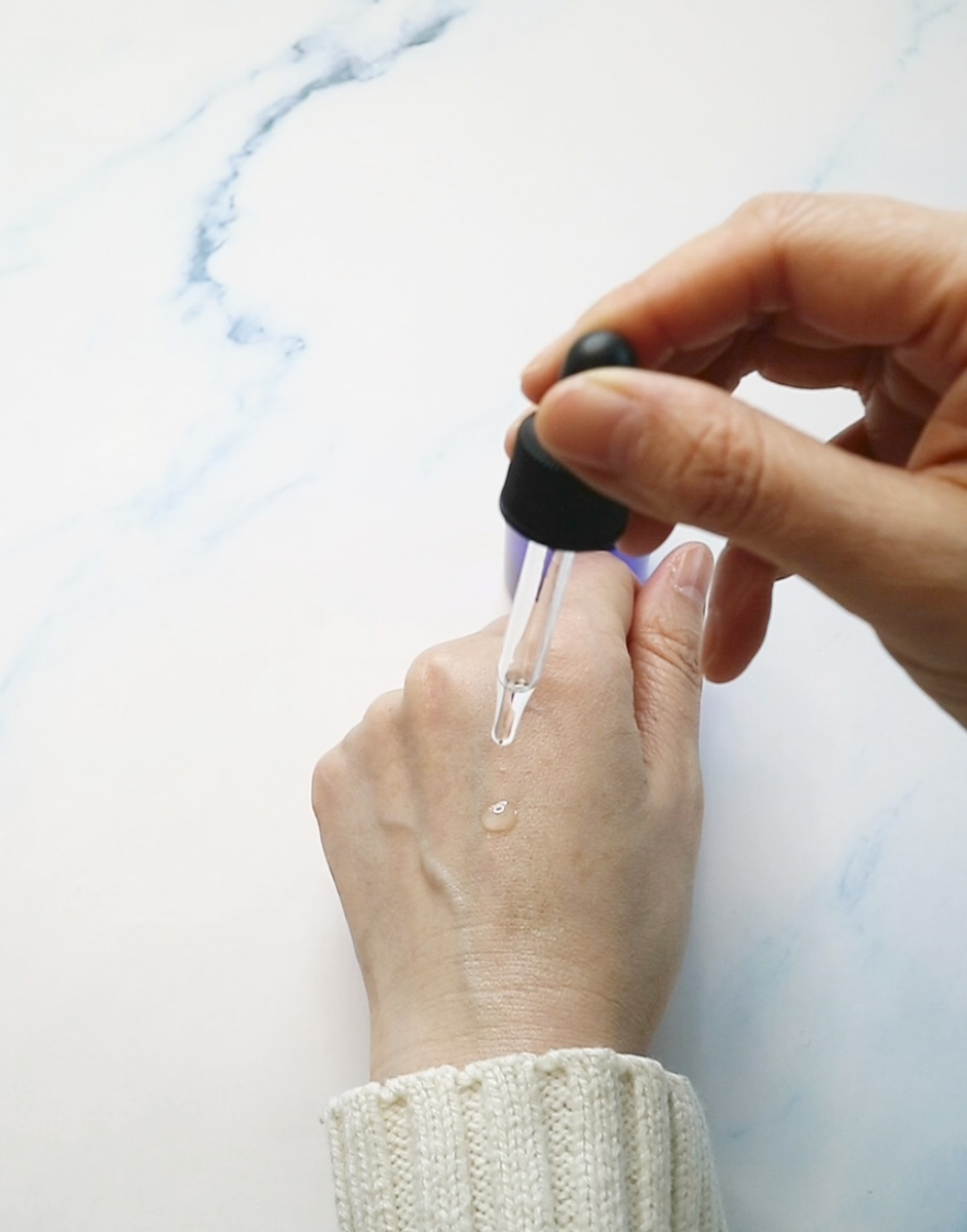 ・スポイトをプッシュし、数滴を手に取りお顔や首になじませてください。